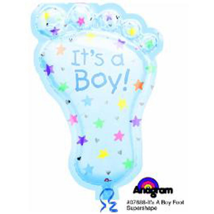 The Its A Boy Foot 32" Shape P35 Pkg is the perfect decoration for celebrating the arrival of a new baby boy. This package includes one 32" foil balloon in the shape of a baby foot with the words "It's A Boy!" printed on it.