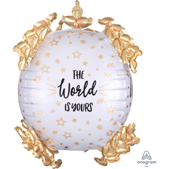 Celebrate your graduate's achievements with our 20" "The World Is Yours" UltraShape Foil Balloon, featuring a sophisticated silver, black, and gold color scheme. This balloon adds a touch of elegance and inspiration to your graduation decor.