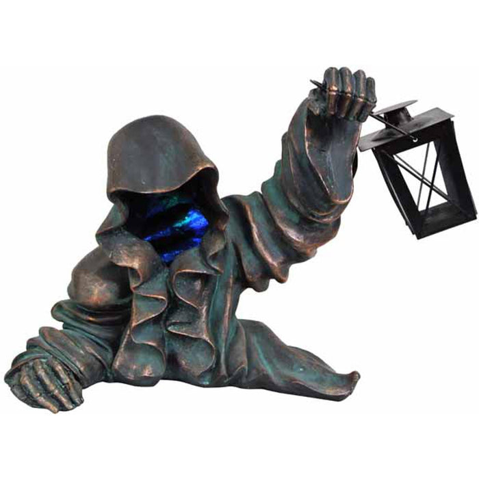 This intricately designed resin statue depicts a grim reaper carrying a lantern through the darkness.