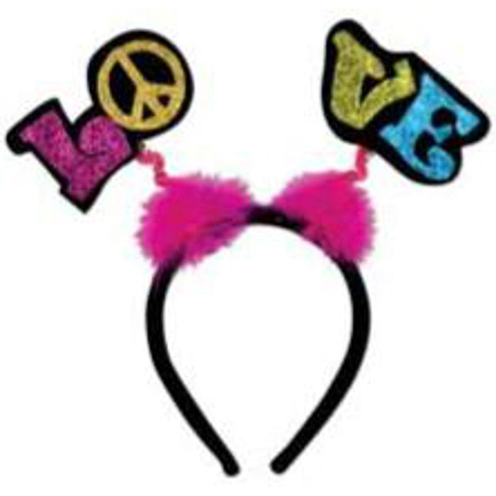 Our Glittered Love Boppers are made with sturdy materials to ensure they stay in place all night long. The headbands are covered in glitter and feature a large, shimmering heart with the word "Love" in the center.