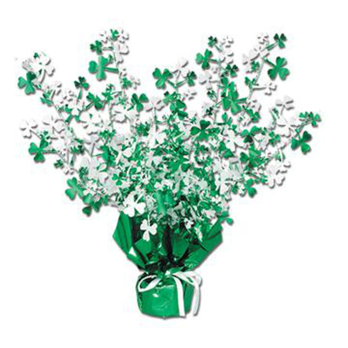 This centerpiece is 15 inches in height and features a green foil base, which gives it a festive and eye-catching appearance. The centerpiece also includes multiple shamrock sprays that create a stunning visual effect.