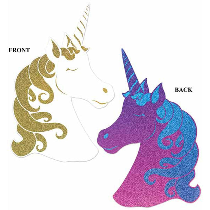 The cutout features a vibrant and colorful design, with a two-sided print that allows you to display it from any angle. The unicorn is beautifully illustrated, with a flowing mane, sparkling eyes, and a golden horn.